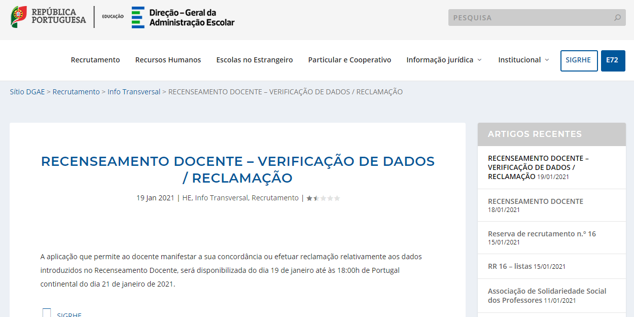 A ATE – Associação dos Trabalhadores da Educação informa o pessoal docente que no espaço de cada docente na plataforma SIGRHE se encontra disponível entre o dia 19 de janeiro e até às 18:00h de Portugal continental do dia 21 de janeiro de 2021 a aplicação Recenseamento Docente 2021 onde pode verificar e CONFIRMAR ou RECLAMAR dos dados inseridos pelas Escolas e Agrupamentos na plataforma.