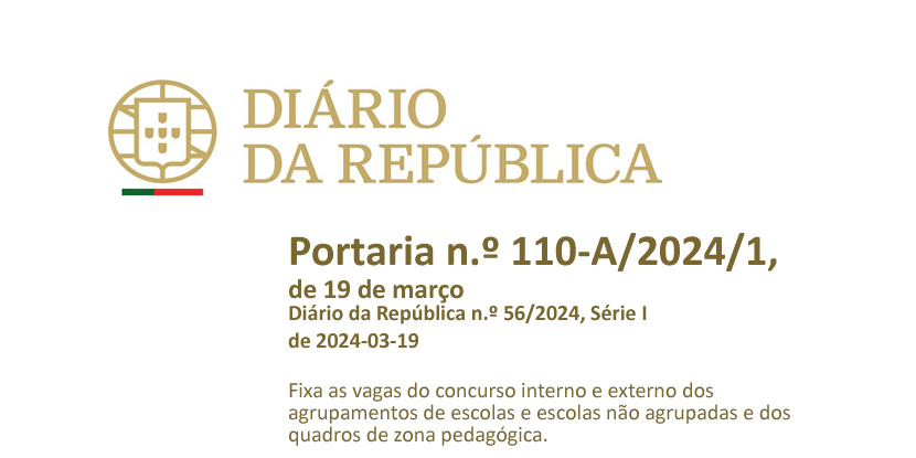 A Associação dos Trabalhadores da Educação informa que foi publicada a Portaria n.º 110-A/2024/1, de 19 março, e que fixa as vagas do concurso interno e externo dos agrupamentos de escolas e escolas não agrupadas e dos quadros de zona pedagógica.