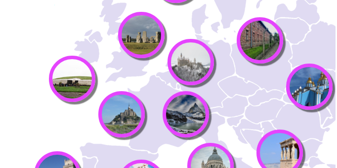 • Mapa interativo da Europa exemplificativo do estabelecimento de pontos comuns entre diferentes vertentes e dimensões do património e respetiva georreferenciação no espaço europeu de molde a unir pontos considerados comuns.