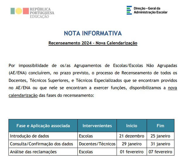 Jan242024DestaquesPublicações Recenseamento 2023/2024 Recenseamento 2024 – Nova Calendarização. Nota Informativa – Recenseamento 2024 – Nova Calendarização Janeiro 24, 2024Partilhar este artigoShare with FacebookShare with TwitterShare with Google+Share with PinterestShare with LinkedInNavegação de post:AnteriorPost anterior:Atualização FAQ Posicionamento Remuneratório Contratados e Reposicionamento na Carreira 2023PróximoPróximo post:Período Probatório 2023/2024 – atualização