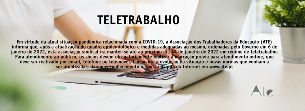 Em virtude da atual situação pandémica relacionada com a COVID-19, a Associação dos Trabalhadores da Educação (ATE) informa que, após a atualização do quadro epidemiológico e medidas adequadas ao mesmo, ordenadas pelo Governo em 6 de janeiro de 2022, esta associação sindical irá manter-se até ao próximo dia 14 de janeiro de 2022 em regime de teletrabalho. Para atendimento ao público, os sócios devem obrigatoriamente realizar a marcação prévia para atendimento online, que deve ser realizado por email, telefone ou telemóvel. Consoante a evolução da situação e novas normas que venham a ser atualizadas, daremos conhecimento na nossa página da Internet em www.ate.pt